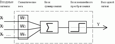 В 1943 году Маккалок и Питтс предложили математическую модель нейрона, формальный нейрон. Как и его биологический прототип, модель нейрона содержит несколько входов и один выход (рис. 1.2). Все компоненты вектора входного сигнала суммируются после умножения на соответствующие веса связи весового вектора , которые определяют силу синаптической связи. Вес связи является скалярной величиной, положительной для усиливающих и отрицательной величиной для тормозящих связей. Над полученным суммарным сигналом (взвешенной суммой) выполняется нелинейное преобразование, определяемое активационной функцией нейрона , т.е. ,где - выходной сигнал. Еще один параметр, которым может обладать нейронный элемент, называется порогом или смещением . Он характеризует смещение функции активации по оси абсцисс. Тогда взвешенная сумма представляется как . Веса связей нейронов удобно представлять в виде матрицы , для которой – вес связи -го нейрона с -м. Функционирование нейрона можно рассматривать как процесс, формирующий выходной сигнал при изменении хотя бы одного из входных сигналов.